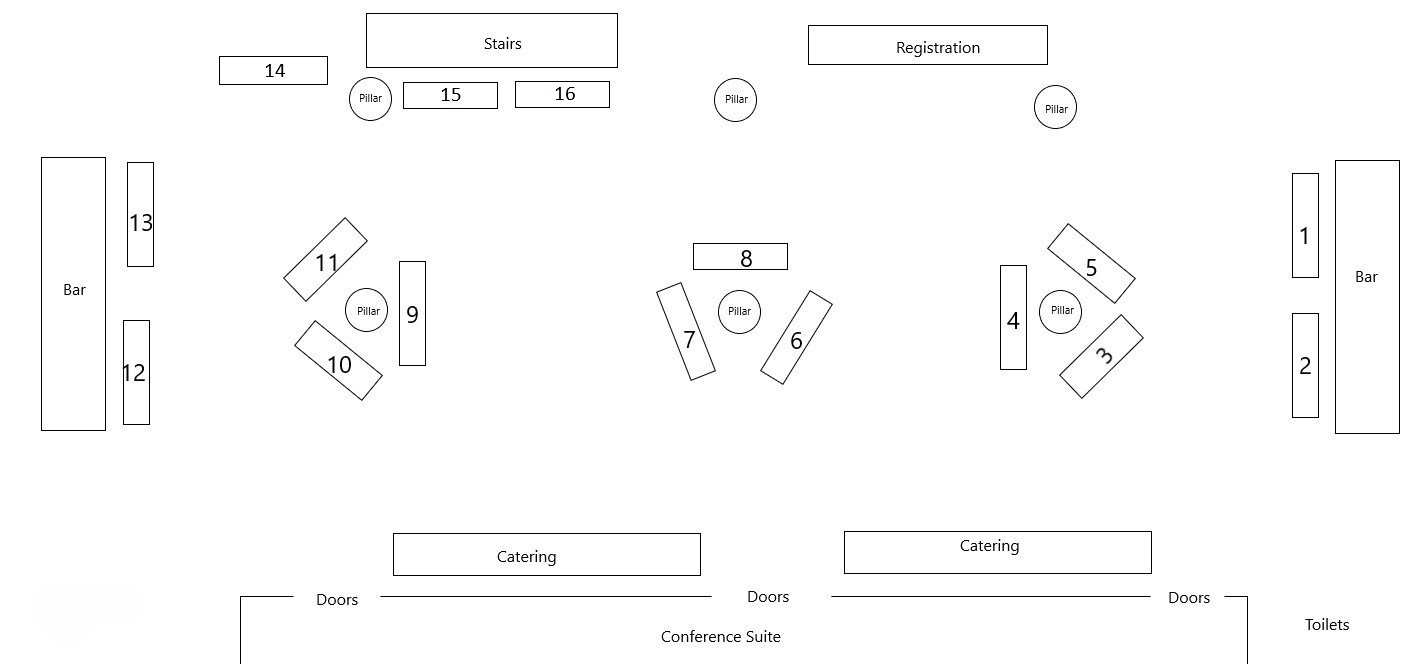 All exhibition stands are located in the foyer outside the conference suite and all coffee breaks will take place here, the floorplan is below. We are using the Megalithic Suite for the conference.